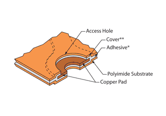 Two conductive layers with an insulating layer between; outer layers may have covers or exposed pads.