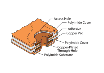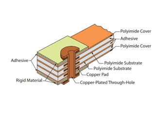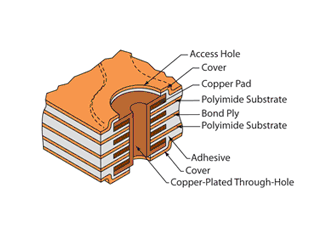 Plated through-holes extend through both rigid and flexible layers (with the exception of blind and buried vias).